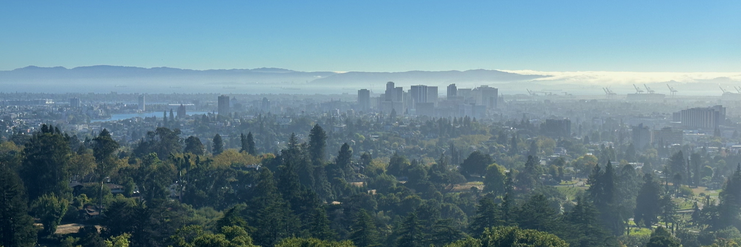 The background picture is a panorama of Oakland and the East Bay, with trees in the foreground and fog in the distance.